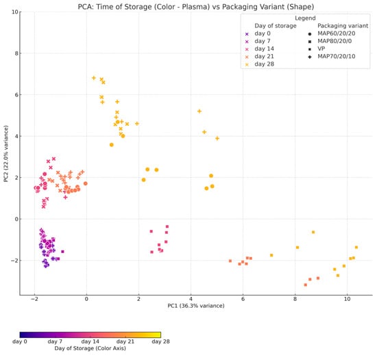 PCA was performed on data containing biochemical and microbiological profiles of beef samples stored under various packaging conditions and over different storage times. The main goals of PCA were to reduce the number of variables while preserving as much information as possible, and to visualise differences between samples based on packaging variant and storage time. PC1 (horizontal axis) and PC2 (vertical axis) are the two principal components that together explain the largest portion of variability in the data, effectively projecting the original variables into a lower-dimensional space. The first two principal components (PC1 and PC2) captured the largest proportion of total variance in the dataset (exact values are shown on the plot axes; Figure 2).