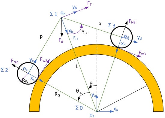 In order to facilitate the description of UAM dynamics, the following coordinate systems are established, namely the pipe center coordinate system : , the UAM center-of-mass coordinate system : , the two wheel coordinate system : , : . Since is the base coordinate system, the following formulations are derived.