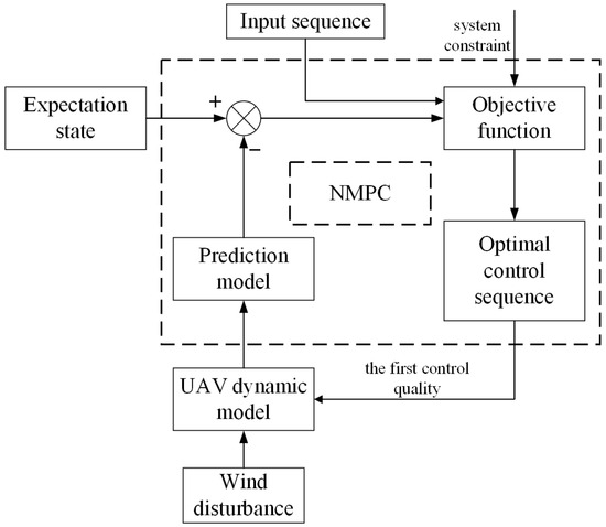 The block diagram of the NMPC system under wind disturbance is shown in Figure 3. First, the current state of UAM is input into the prediction model to obtain the future multi-step state vector under wind disturbance. Then, the objective function is constructed by combining the reference state and the control sequence. Taking full account of the system constraints, the objective function is solved within the control period to obtain the optimal control sequence that minimizes it. Only the first one is taken as the control input of the current UAM to obtain the state at the next moment. The next control cycle is entered and the rolling optimization is carried out continuously. Finally, the stability of UAM on the transmission pipeline is realized.