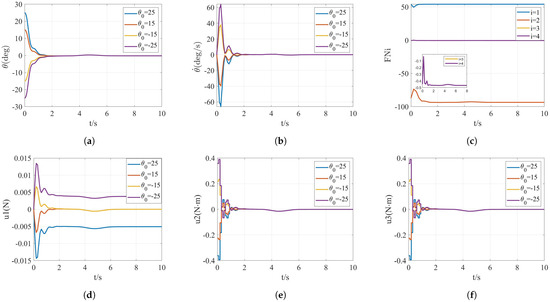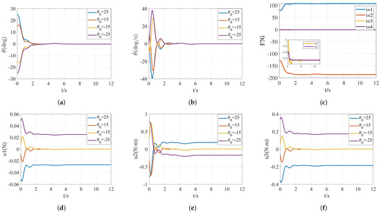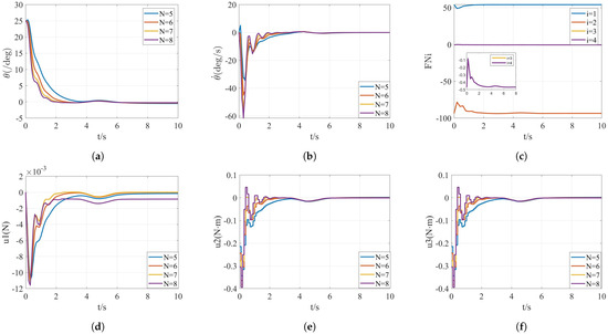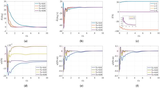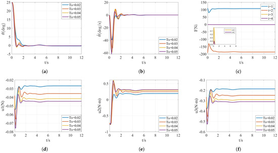In Figure 9a,b, the state variables and have the shortest regulation time when . In addition, the state curves are smoother with fewer oscillations when . The state fluctuates at a maximum of 40 deg/s when . However, the curves fluctuate at a maximum of 60 deg/s with the other three values of . Furthermore, the compensation of inputs is also the least when . As can be seen in Figure 9d–f, the compensations are, respectively, 0.026 N, 0.2 N·m, 0.18 N·m. Therefore, the sampling period is optimally selected as .