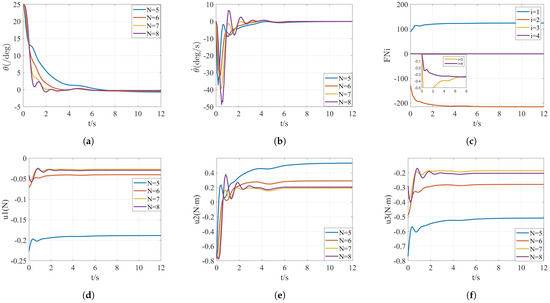 Simulation results of case 1 with variable N, where (a,b) denote the response curves of the states, (c) denotes the four constraint satisfaction cases, and (d–f) denote the response curves of the inputs.