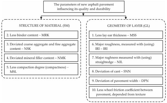 The significance of the parameters of the asphalt layers of road pavement structures, for which monetary deductions (MDs) are calculated for exceeding the permissible deviations (PDs) or not complying with the limit values (LVs) according to the requirements of ĮT ASFALTAS 08, determined by a team of 71 experts of rank, is presented in