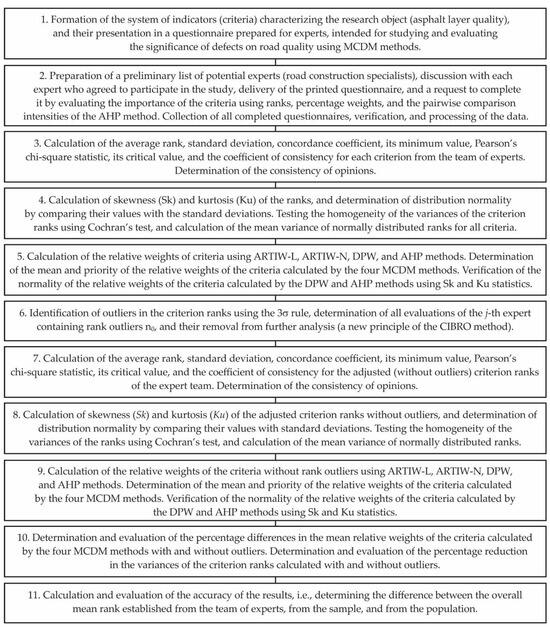 for the entire object under study (asphalt layer) cannot be calculated using Formula (8). The degree of homogeneity of variances can likely be increased by removing outliers from the study. The threshold values for outliers of each criterion’s ranks, calculated from Formulas (12) and (13), and the serial numbers of the experts and their outlier (rejected) ranks assigned to the criteria are presented in