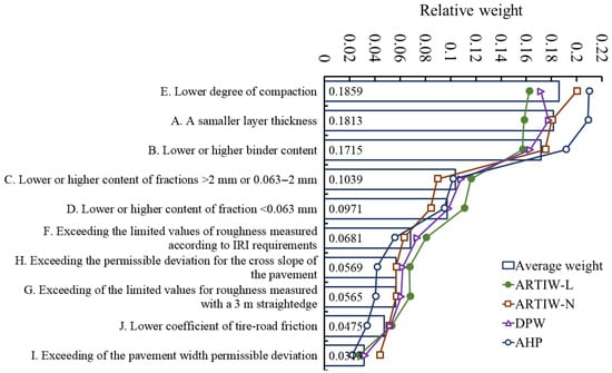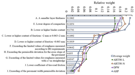 The arithmetic means of the significances of the road pavement layer quality-indicator defects, expressed as relative weights and calculated using four MCDM methods, are presented in the bar chart (