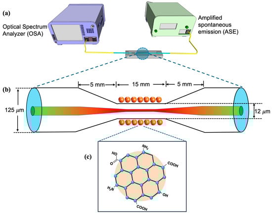 Optical fiber sensors have attracted significant interest in chemical and biosensing applications due to their impressive performances and enormous potential in sensing technologies. Since then, optical fiber sensors have been incorporated into diverse sensing platforms, and tremendous efforts have been made to improve their performance. One effective strategy involves tapering the optical fiber, which reduces its diameter and strengthens the evanescent field interaction with the surrounding medium along the fiber waist. To further improve the sensor performance, researchers have explored the use of nanomaterials as surface modifiers. These materials range from metallic nanoparticles [1,2] to carbon-based nanostructures [3,4]. When deposited on the fiber surface, nanomaterials increase the interaction area between the propagated light and the sensing elements, owing to their high surface-to-volume ratio. Recent studies have demonstrated that integrating nanomaterials with tapered optical fibers (TOFs) can significantly enhance sensing performance by combining the optical advantages of tapering with the functional benefits of nanomaterials [4,5].
