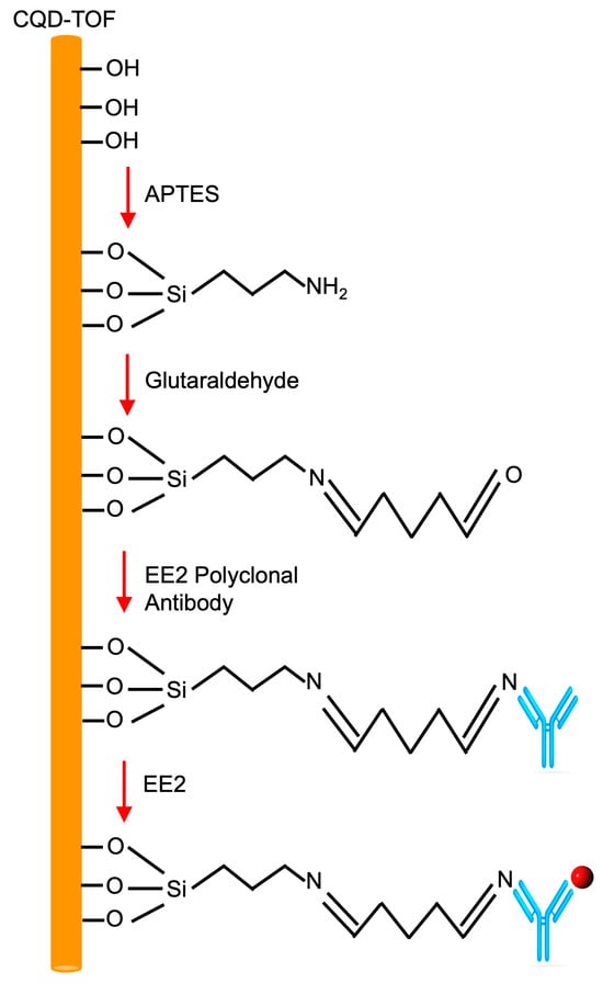 The sensing layer of EE2 detection onto the CQD-TOF using bi-functional linkers of NaOH, APTES, Glutaraldehyde, EE2 antibody (represented as the blue y-shaped symbol), and EE2 (as the red circle).