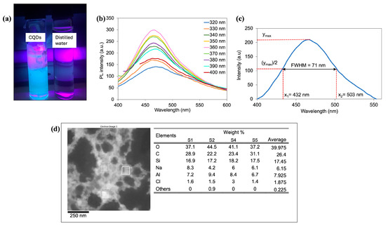 The optical properties and composition of the characterized CQDs. (a) The CQDs solution was compared to distilled water when both were exposed to UV light. (b) The PL spectra of the CQDs at different excitation wavelengths. (c) FWHM of the PL intensity for CQDs under excitation of 360 nm. (d) Elemental composition of CQD solution in EDXS.