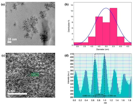 TEM analysis: (a) TEM image of CQDs, (b) particle size distribution histogram, (c) high-resolution TEM image of CQDs with the green box indicating the region selected for lattice fringe analysis, and (d) corresponding intensity profile showing the interplanar spacing value of 0.309 nm.