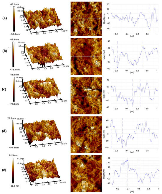 Surface topography of AFM images (1 μm × 1 μm) of CQD with different deposition times: (a) 10 min, (b) 20 min, (c) 30 min, (d) 40 min, and (e) 50 min. The figure displays the topographic scan in 3D on the left, in 2D in the center, and the height profiles along the corresponding line on the right.