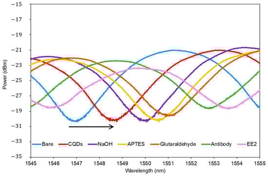 Figure 7 shows the output spectrum of TOF before any surface modification and after incubation with CQD, NaOH, APTES, glutaraldehyde, the EE2 antibody, and the target analyte of EE2. Spectra were taken when the TOF had been completely dried. The observed consistent red shift indicates the increment of refractive index at the surface area, resulting from the formation of layers by bi-functional linkers between molecules. This confirms the successful development of a sensing layer for EE2 detection using bio-functionalized CQD-TOF.