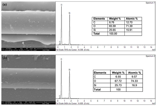 The surface morphologies of the CQD-TOF after the introduction of antibody and EE2 were observed using FESEM under 10k magnification, as shown in Figure 8. In conjunction with the FESEM, EDXS analysis was performed to identify the elemental composition of each TOF sample. Figure 8a shows that the surface morphology after antibody immobilization exhibited large strand-like structures dispersed across the surface, likely due to the relatively large size of antibodies. In contrast, Figure 8b illustrates a smoother surface texture after the introduction of EE2, suggesting conformational changes and indicating the successful binding of EE2 to the bound antibodies. Meanwhile, both EDXS spectra indicate similar elemental trends, with O being the most abundant element, followed by Si and C. However, after EE2 exposure, a reduction in C and an increase in Si and O content were observed. These significant variations in the atomic weight of molecules before and after EE2 detection suggest the successful formation of a new bond between antibodies and EE2 [45].