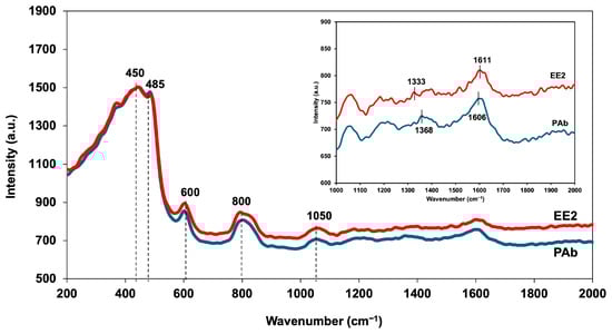Raman spectroscopy analysis on CQD-TOF was performed to identify molecular changes after the introduction of EE2 polyclonal antibody (PAb) and EE2. Figure 9 displays the Raman spectra of PAb and the target analyte EE2 from 200 to 1600 cm−1. The bending vibration and symmetric stretching of the Si-O-Si linkage is associated with band peaks at 450, 485, 600, and 800 cm−1 [46,47,48]. The vibrational mode of C-H bonds was observed at the 800 cm−1 band peak [49], while the C-O stretching was identified at 1050 cm−1 peak [50]. Lastly, the N-H bending associated with C-N stretch deformation in the Amide II bond was detected at 1600 cm−1 [50]. The inset of Figure 8 shows an enlarged section of the spectra, highlighting the D- and G-bands from the earlier CQD deposition. Notably, the D-band peak shifted from 1368 to 1333 cm−1 and the G-band peak shifted from 1606 to 1611 cm−1, indicating a difference in the spectra before and after EE2 detection. Specifically, the D-band shifted to a shorter wavelength, while the G-band shifted to a longer wavelength. These shifts can be a result of chemical modifications, such as the increment of oxygen-containing functional groups on the sensing surface layer, which alter the carbon structure and its vibrational properties [51].