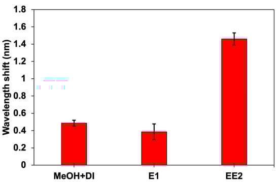 A selectivity test was conducted to evaluate the ability of the CQD-TOF sensor to selectively detect the target analyte, EE2, while disregarding other estrogen hormones. Figure 10 shows the wavelength shift differences for estrone (E1) and EE2, at 1 ng/L. For comparison, the wavelength shift in a methanol solution diluted in deionized water (MeOH + DI), which served as a blank for both E1 and EE2, was also measured. The results demonstrated that E1 exhibited a slight wavelength shift, comparable to that of the blank solution, suggesting the responses were due to non-specific binding. In contrast, the sensor response to EE2 showed the largest and most significant wavelength shift, indicating strong selectivity towards EE2. This high selectivity can be attributed to the strong affinity between EE2 and the immobilized antibodies on the sensing surface. Furthermore, the integration of CQDs provides more active sites, enhancing the interaction between antibodies and EE2.