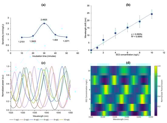 Therefore, the 30-min incubation time was identified as the optimal incubation period, resulting the highest sensitivity at 2.4925 nm/(ng/L). To verify reproducibility under this optimized condition, triplicate measurements were performed using independently prepared samples. The resulting spectra showed consistent wavelength shifts, and the averaged values with standard deviations ±2.51 (Figure 11b). As shown in the figure, the wavelength shift increases linearly with the EE2 concentration in the range of 1–10 ng/L, with an excellent correlation coefficient (R2 = 0.9945). Figure 11c displays the overlaid normalized transmission spectra at different EE2 concentrations, qualitatively illustrating the interference fringes caused by refractive index changes from antibody–EE2 binding. However, the wavelength shift obtained to determine the sensor sensitivity were extracted from individual dips or peaks rather than directly from the overlapping curves. To provide a clearer visualization of this spectral evolution, Figure 11d shows the same data in a heatmap format (1525–1550 nm), where the spectra dips indicated by the darker intensity, and the peaks indicated by the lighter intensity.