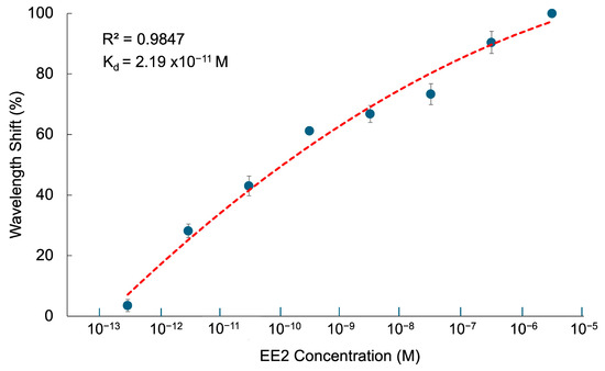 where denotes the wavelength shift caused by EE2 adsorption onto the CQD-TOF sensor, is the EE2 concentration, signifies the maximum wavelength shift, and is the equilibrium binding dissociation constant. The calculated was found to be 2.19 × 10−11 M, with R2 = 0.9847. The lower value revealed that the CQD-TOF has a higher affinity towards EE2 compared to what was achieved without the integration of CQDs in [55]. The improvement is most likely due to the increment of surface area relative to the volume of CQDs, leading to a rise in the number of interaction sites and, consequently stronger binding affinity. This finding validates that integrating the CQDs on the TOF as an active sensing layer onto the TOF sensor is essential for improving EE2 detection.