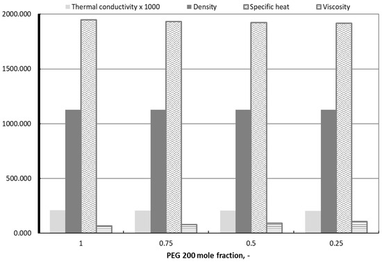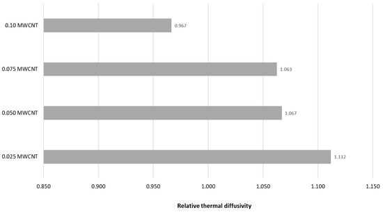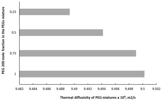 The thermal diffusivity experimental results for the investigated suspensions are presented in Figure 4. Thermal diffusivity defines the ability of a given material to exchange heat. Thus, from Figure 4, one can see that at room temperature, the thermal diffusivity of PEG 400 fluids with MWCNT nanoparticles is increasing. When these outcomes correlate with variations in the Pr number, we can see the major positive influence of the addition of NPs. Thus, the addition of NPs causes an upsurge in thermal diffusivity up to 11.2%, although Pr also increases with the increase in NP concentration, proving a relative development in heat transfer. Furthermore, in Figure 5, the thermal diffusivity for the PEG mixtures is plotted, showing a decrease in thermal diffusivity with an increase in the percentage of PEG 400 in the mixture. This phenomenon is ascribed mainly to PEG 200’s lower thermal conductivity when compared to the one of the higher-molar-mass PEGs (i.e., PEG 400).