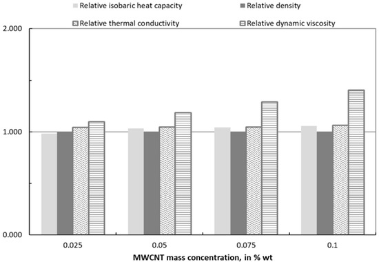 In Figure 1, the thermophysical properties of the base fluids are depicted, while in Figure 2, those of the nanocolloids are depicted. The suspension’s thermophysical properties (see Figure 2) reveal that the addition of extremely low-mass concentrations of MWCNTs does not significantly influence the specific heat or density, but it does have a more significant impact on viscosity and thermal conductivity. This phenomenon is normal when carbon-based materials are involved, especially due to their high density and upsurged thermal conductivity.