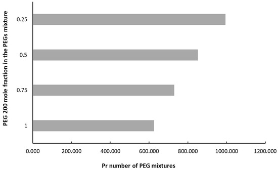 From Figure 3, we see the variation in the Pr number for the mixtures of PEG, where 1 represents 100% PEG 200. Analyzing the data, it can be seen that Pr increases with the addition of PEG 400 to the mixture, an upsurge that appears to be due to the high viscosity and low thermal conductivity of PEG 400.