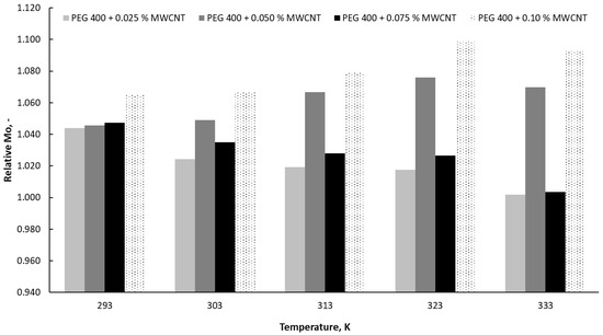 From Table 2, one can see an upsurge in Pr when MWCNTs are suspended in PEG 400, a phenomenon that is attributable to the increase in viscosity, which means that thermal transport becomes more difficult. The increase extends to 41.4% at ambient temperature, but it extends to 109.33% at 333.15 K. Moreover, the MWCNT’s loading increases the Pr number, and this increase depends highly on the nanoparticles’ concentration. From Table 2 it can also be seen that the addition of a very small quantity of NPs leads to an increase in Pr of about 5%.