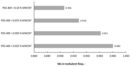 In turbulent flow (see Figure 7), where the viscosity takes the lead in terms of transport, another phenomenon occurs, and the addition of MWCNTs actually decreases Mor. This observation correlates with the Pr number investigation. The decrease is more pronounced once the NP loading in each of the suspensions upsurges.