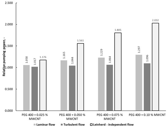 A different approach can be seen in Figure 8, where Equation (10) is employed in the analysis. Here, there is an increase in the pumping power of maximum (100%) for MWCNT-based nanocolloids, unrelated to the type of movement.