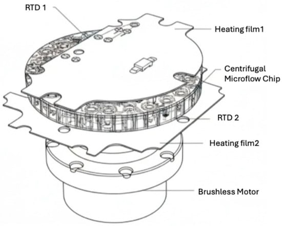 Illustration of the device used to contain, control, and monitor the temperature. Centrifugal microfluidic liver-function test platform with RTD-based feedback and fuzzy-PID control. Film heaters above and below the disc regulate zone temperatures, while a fan provides forced convection. On-disc absorbance measurements of AST and ALT are performed directly from whole blood [26].