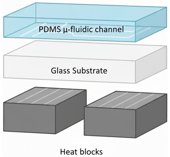 Also, (Kim et al.) [28] successfully maintained constant temperature in a microfluidic PCR chip using proportional–integral–derivative (PID) control. As shown in Figure 2, this system employs silicone rubber heater(s) for denaturation and extension zones, regulated by a PID controller. A thermocouple inserted near the polydimethylsiloxane (PDMS) microchannel provides real-time temperature feedback. The PID controller continuously adjusts heating elements based on actual versus desired temperatures, ensuring precise temperature control throughout the PCR process. Integration of the PID system enabled stable temperatures in denaturation, annealing, and extension zones, crucial for reliable DNA amplification.