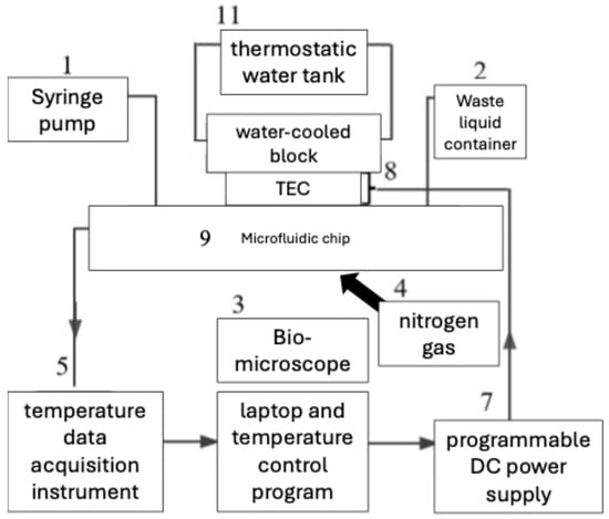 On this principle, Zhilin Liu and colleagues reported that the temperature of the microfluidic chip has been successfully controlled using a combination of a thermoelectric cooler (TEC) and an adaptive fuzzy PID control strategy [15]. A direct current drives the TEC to achieve energy conversion for both cooling and heating functions. By adjusting the current flow through the TEC, the cooling capacity can be controlled, allowing precise temperature regulation of the microfluidic chip. The adaptive fuzzy PID control strategy combines fuzzy logic, neural networks, and PID control to dynamically adjust the control parameters based on system feedback and error signals. Figure 4 shows the experimental set up applied, where No. 1 is a syringe pump, No. 2 is waste liquid container, No. 3 is a biomicroscope, No. 4 is a nitrogen gas, No. 5 is a temperature data acquisition instrument, No. 6 is a laptop and temperature control program, No. 7 is a programmable DC power supply, No. 8 is the TEC, No. 9 is the microfluidic chip, No. 10 is water-cooled block, and finally No. 11 is a thermostatic water tank. Heat from the TEC’s hot side is dissipated through the water-cooled block (No. 10), which is connected to the thermostatic bath (No. 11). This configuration stabilizes the hot-side temperature and preserves the desired ΔT, without sufficient heat sinking, the TEC saturates, and control accuracy deteriorates.