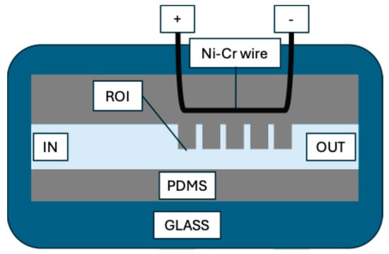 Also, Sung Yong Jung and colleagues reported successful temperature control of a microchannel heat sink device using a Ni-Cr wire heater integrated into the PDMS channel [33]. As shown in Figure 6, the Ni-Cr wire heater, with a diameter of 0.3 mm, is positioned within the microchannel and connected to a power source for heat control. Applying an electrical current to the Ni-Cr wire heater generates heat within the microchannel, allowing for precise temperature control during experiments. Temperature sensors may be utilized to monitor and adjust the temperature of the device as needed. This setup enables the researchers to regulate the temperature within the microchannel heat sink, facilitating the study of heat transfer characteristics under controlled thermal conditions.