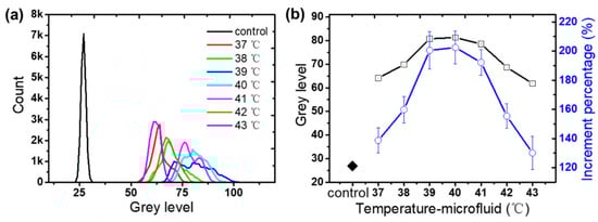 (a) Distribution profile of grayscale intensity values ranging from 0 to 255, representing pixel brightness levels across captured images. (b) Plot of the weighted average grayscale values for each image, along with the corresponding percentage increase relative to the control group, as a function of varying microfluidic temperatures [29].