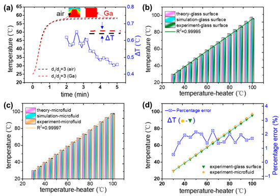 (a) Graph illustrating the temporal evolution of both absolute temperature (left y-axis) and temperature deviation (right y-axis), comparing scenarios with and without liquid metal introduced into the interface gap. In this case, the ratio of gap dimensions is set to d1/d2 = 3. (b) Depiction of theoretical, simulated, and experimentally obtained temperature values at the glass surface across a controlled temperature range of 30–100 °C. (c) Corresponding temperature data for the microfluidic channel under identical conditions. (d) A comparative analysis of experimental temperatures measured at the glass substrate and within the microchannel reveals a mean temperature discrepancy of approximately 1.74% [29].