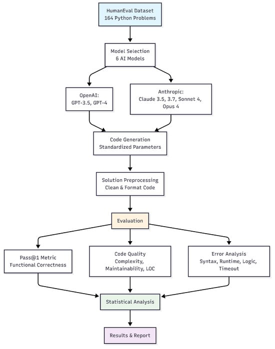 This study employed a comprehensive comparative evaluation framework to assess the Python code generation capabilities of six state-of-the-art artificial intelligence models using the HumanEval benchmark dataset (Figure 1). The HumanEval dataset, developed by Chen et al., consists of 164 hand-written Python programming problems designed specifically for evaluating functional correctness of AI-generated code [1]. Each problem contains a function signature with natural language specification, comprehensive test cases for automated validation, and a canonical reference solution [1]. The dataset encompasses diverse programming concepts including string manipulation, mathematical computations, data structure operations, and algorithmic problem-solving tasks, providing a robust foundation for comparative model assessment [1]. The complete dataset was obtained from the official OpenAI GPT repository in JSONL format and utilized without modification to ensure standardized evaluation conditions.