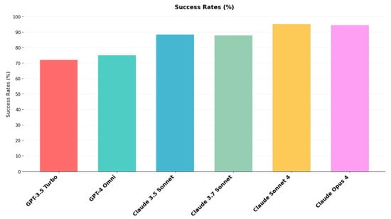 The Pass@1 success rates demonstrated clear performance hierarchies across the evaluated models. Claude Sonnet 4 achieved the highest functional correctness with a 95.1% success rate, closely followed by Claude Opus 4 at 94.5%. The Anthropic Claude model family consistently outperformed OpenAI GPT models, with Claude 3.5 Sonnet reaching 88.4% and Claude 3.7 Sonnet achieving 87.8% success rates. In contrast, OpenAI GPT models showed notably lower performance, with GPT-4 Omni achieving 75.0% and GPT-3.5 Turbo reaching 72.0% success rates (Figure 2).