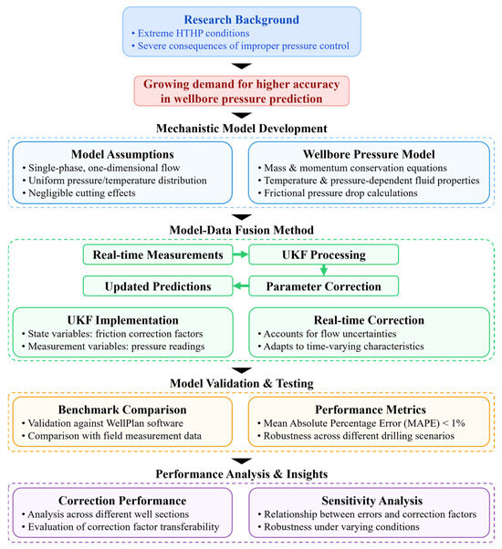Currently, wellbore pressure can be obtained through two main approaches: direct instrument measurement and model-based prediction. Instrumentation provides the most direct and accurate measurements. However, under HTHP downhole conditions, many sensors fail to function reliably. Additional challenges include limited signal transmission capabilities, slow data transmission rates, and the high cost of specialized downhole instruments. Model-based prediction, on the other hand, estimates pressure profiles within the drillstring and annulus by developing wellbore fluid flow models. Studies of model-based prediction can be grouped into three streams. (1) Mechanistic modeling: transient single-/two-phase wellbore models improve physical fidelity, yet their accuracy hinges on empirical friction/slip correlations; under HTHP, these correlations become sensitive to unmodeled temperature-rheology coupling, causing bias. (2) Data-driven/AI inversion: machine-learning estimators provide rapid parameter updates but often suffer from limited interpretability, task-specific training, and weak generalization across wells/operations [4,5,6]. (3) Model-data fusion with Kalman-type filters: KF/EKF/EnKF/UKF have been introduced to correct states/parameters online in drilling hydraulics and related subsystems [7,8,9,10,11,12,13,14,15,16,17,18,19,20]. However, most implementations (a) apply a single, unified friction correction to the entire circulation system, overlooking domain-specific hydraulics in the drillstring versus annulus [21,22]; (b) lack generalizability analyses across markedly different friction-drop partitions [23,24]; and (c) seldom address HTHP-induced variability where temperature/pressure reshape rheology and friction in a time-varying manner [25,26].
