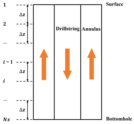 Calculation of the proposed fluid flow model necessitates grid discretization of the wellbore. As shown in Figure 2, the wellbore of length is uniformly discretized into grid segments with a step size of , resulting in ( = + 1) nodes. These storage nodes are utilized to store parameters such as pressure, temperature, drilling fluid velocity, drilling fluid density, well trajectory, and wellbore structure. The bottomhole and surface are labeled as and 1, respectively, and represents the vertical distance between adjacent storage nodes. The annulus outlet pressure serves as a known boundary condition. For the pressure in the annulus, the calculation proceeds from the surface to the bottomhole; for the pressure in the drillstring, the calculation proceeds from the bottomhole to the surface.