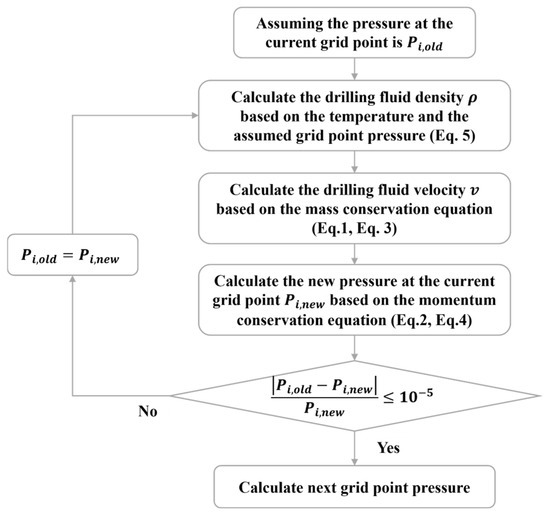 During the calculation of wellbore pressure, the temperature and pressure of the drilling fluid in the wellbore influence the density of the drilling fluid. The density of the drilling fluid, in turn, affects both the gravitational pressure drop and the frictional pressure drop, ultimately impacting the wellbore pressure. Consequently, an iterative process is required for the calculation of wellbore pressure and drilling fluid density. A schematic diagram of the iterative process is illustrated in Figure 3.