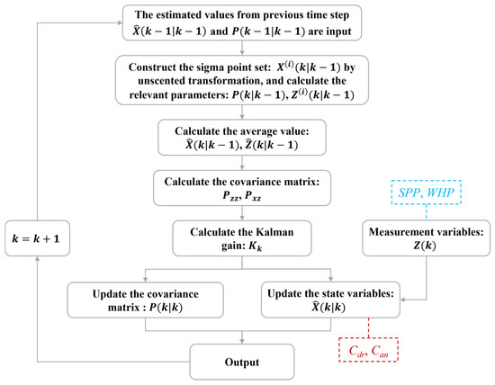 After determining the state equation and measurement equation, they are incorporated into the UKF computational model based on the previously described inversion algorithm. By providing the measurement data, the friction correction factor can be solved. The computational process is illustrated in Figure 5, and the pseudocode for the UKF implementation is presented in Figure A1 in Appendix A.