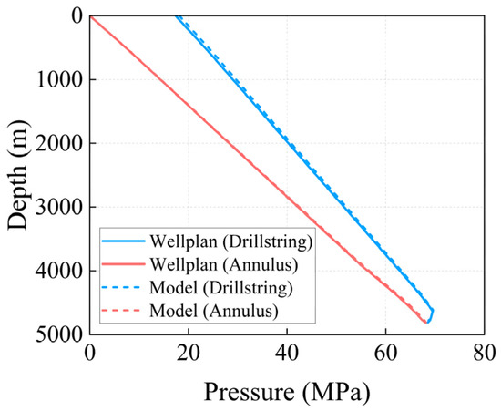 To validate the model, comparative analyses were successively performed against both the pressure calculations from WellPlan (a commercial software launched by Halliburton, Version 5000.14.0.12958) and the actual pressure measurements obtained from the well.