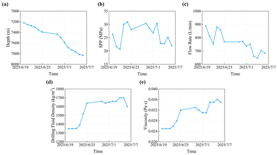 Logging data from Well #2: (a) Well depth; (b) SPP; (c) Flow rate; (d) Drilling fluid density; (e) Drilling fluid viscosity.