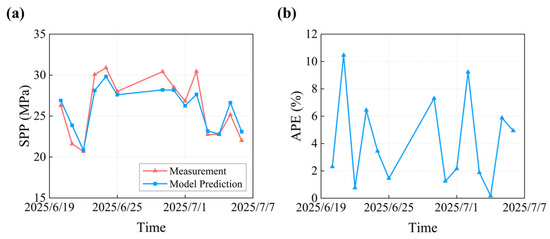 The calculation results for Well #2: (a) Comparison between SPP measurement and calculated SPP; (b) APE vs. time.
