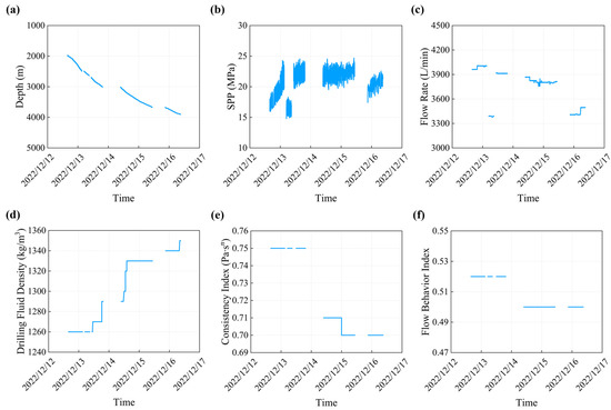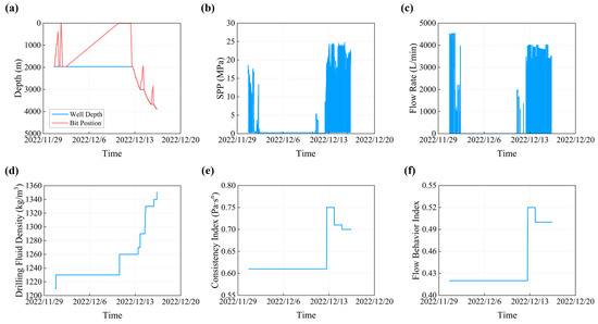 Logging data from the third drilling phase: (a) Well depth and bit position; (b) SPP; (c) Flow rate; (d) Drilling fluid density; (e) Consistency index; (f) Flow behavior index.