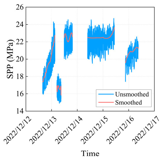 The measurement noise covariance matrix was set to 0.052 based on the accuracy of the field instruments. The system noise covariance matrix was set to 0.022 based on the 2.46% discrepancy observed between the proposed model and the WellPlan benchmark (Section 2.3). A sensitivity analysis was conducted to evaluate the sensitivity of filter performance to and , and determine their optimal values. This analysis was performed using the logging data from the third drilling phase of Well #1 (as detailed in Section 3.1). The results (Figure A2) indicate that the MAPE of SPP was insensitive to the variation of . For , the MAPE plateaued when was reduced below 0.0022, suggesting a point of diminishing returns on performance improvement. Therefore, 0.0022 was selected as the optimal value of to ensure robust estimation performance.