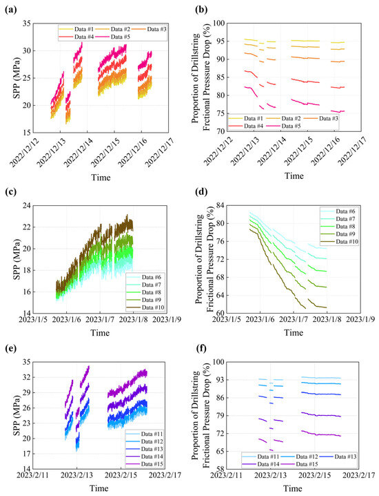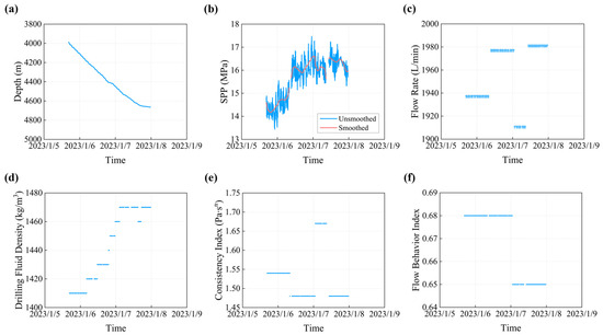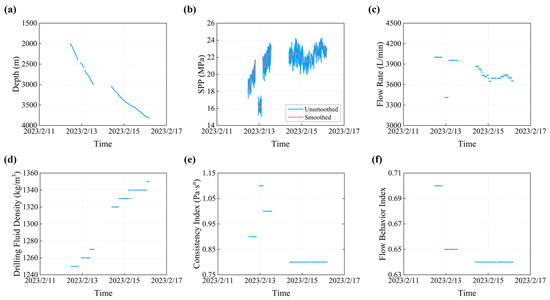 Filtered logging data from the third drilling phase: (a) Filtered depth; (b) Filtered SPP; (c) Filtered flow rate; (d) Filtered drilling fluid density; (e) Filtered consistency index; (f) Filtered flow behavior index.