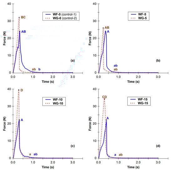 The change in the color of the wheat crackers under a rising dose of CRPW reflected the shades of the WF, WG, and non-fortified cracker pair WF-0 and WG-0 (Figure 1). A more pronounced darkening in the WF subset of crackers was found to be statistically significant (P = 95%). Regarding control-1 and control-2 as the non-fortified crackers, the darkness “100 − L*” of the most enriched crackers WF-15 and WG-15 increased by approximately 180% and 120% (from 22.22 for WF-0 to 40.20 for WF-15 and from 36.02 for WG-0 to 44.92 for WF-15, respectively; Table 2). The yellowness b* exhibited an expected reverse tendency, decreasing by approximately 48% and 44%. In the redness a*, as the third color coordinate, the three fortified crackers baked from wheat white flour exhibited a gradual darkening, but a significant change was only observed in the pair WF-0 and WF-5 (perhaps due to the first verifiable increase in proportions of non-cereal protein and fat).