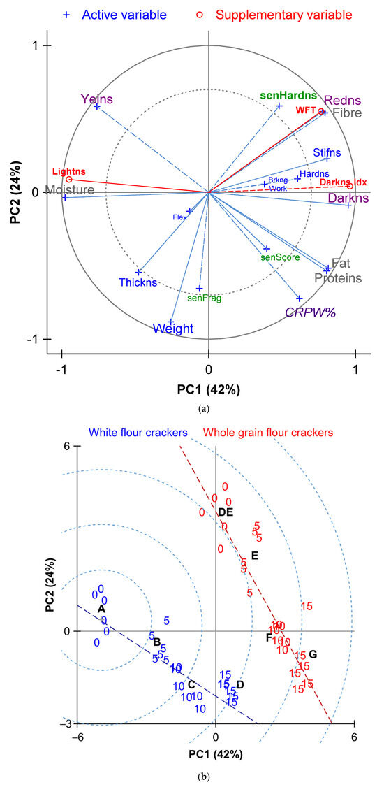 Reciprocal relationships among all determined physical parameters of the cracker, as well as quality of the cracker variants, were explored in terms of the Principal Component Analysis. In the line plot of variables, an inner circle representing 70% data variability was newly drawn; the percentage represents the minimal portion of the explained data variability for a successful PC model. A percentage of explained variability of the each of 18 active and 4 supplementary variables by the first three principal components are presented into Table A4 (Appendix A). Additionally, using the procedure invented by Chabanet [21], the importance of variables was distinguished by decrease in letter sizes. The PCA scatter plot of samples was generated by the calculation of the Euclidean distances to the WF-0 sample (control-1 cracker) in the PC1 and PC2 plane, and by the drawing of concentric circles centered on this control-1.