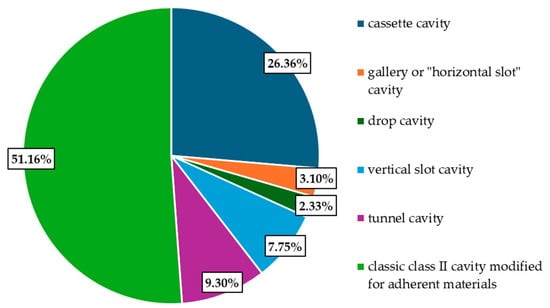 Regarding the cavity preparation technique, the majority of participants prefer the classic modified class II cavity for adhesive materials (66 participants, 51.16%), followed by the “box” cavity preferred by 34 individuals (26.36%), the “vertical slot” cavity chosen by 10 participants (7.75%), then the “tunnel” cavity preferred by 12 respondents (9.30%), and, lastly, the “gallery” or “horizontal slot” cavity and the “drop” cavity, each preferred by less than 5% of respondents (Figure 1).