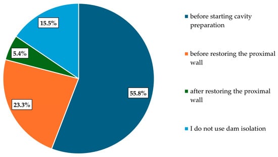 Among the respondents in our study, more than half consider the optimal moment to apply the rubber dam system to be before starting cavity preparation. Thirty participants prefer applying it before restoring the proximal wall, seven after restoring the proximal wall, and, unfortunately, twenty participants do not use rubber dam isolation at all (Figure 2).