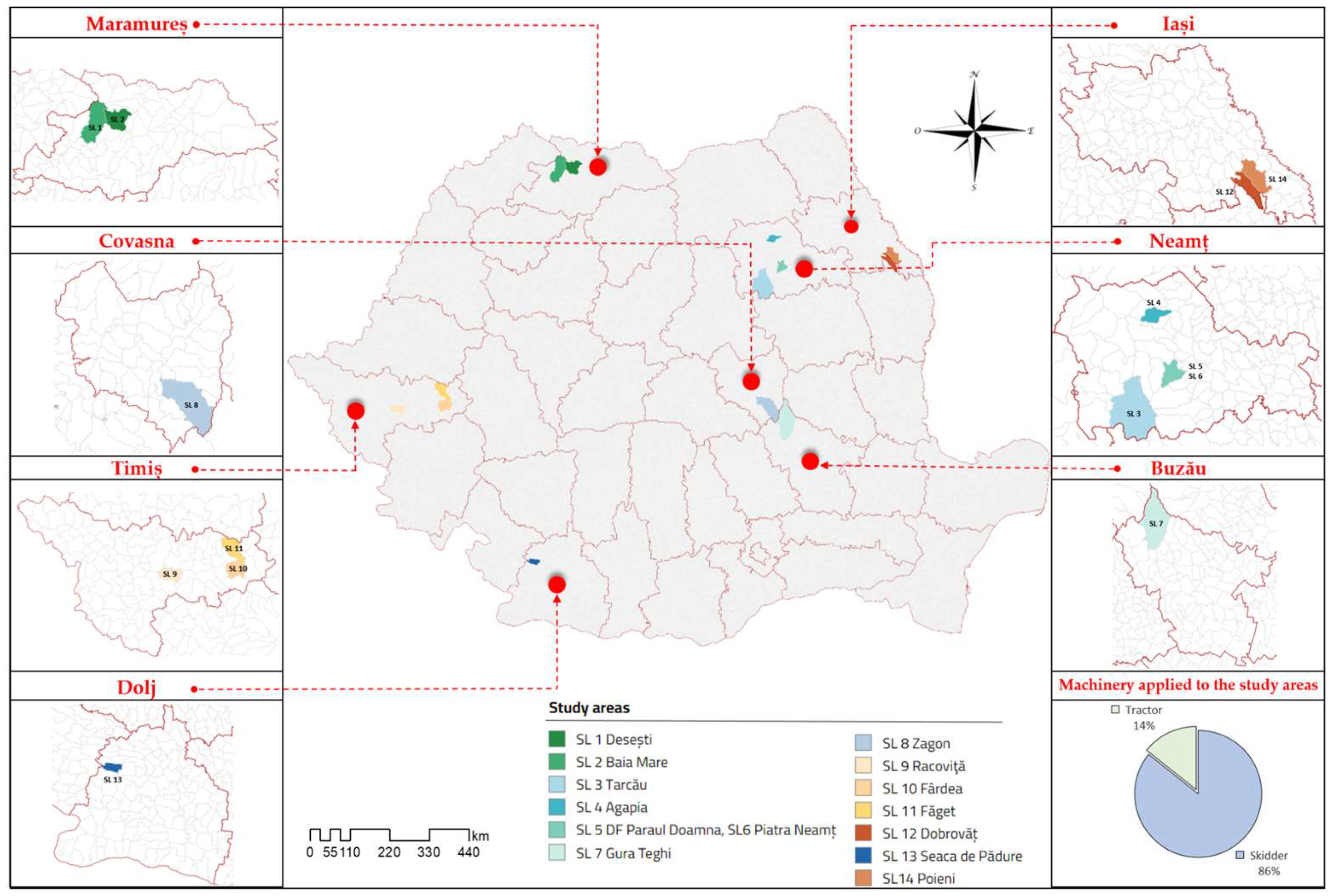 - Borz, S.A.; Dinulica, F.; Birda, M.; Ignea, G.; Ciobanu, V.D.; Popa, B. Time consumption and productivity of skidding Silver fir (Abies alba Mill.) round wood in reduced accessibility conditions: A case study in windthrow salvage logging from Romanian Carpathians. Ann. For. Res. 2013, 56, 363–375. [Google Scholar]