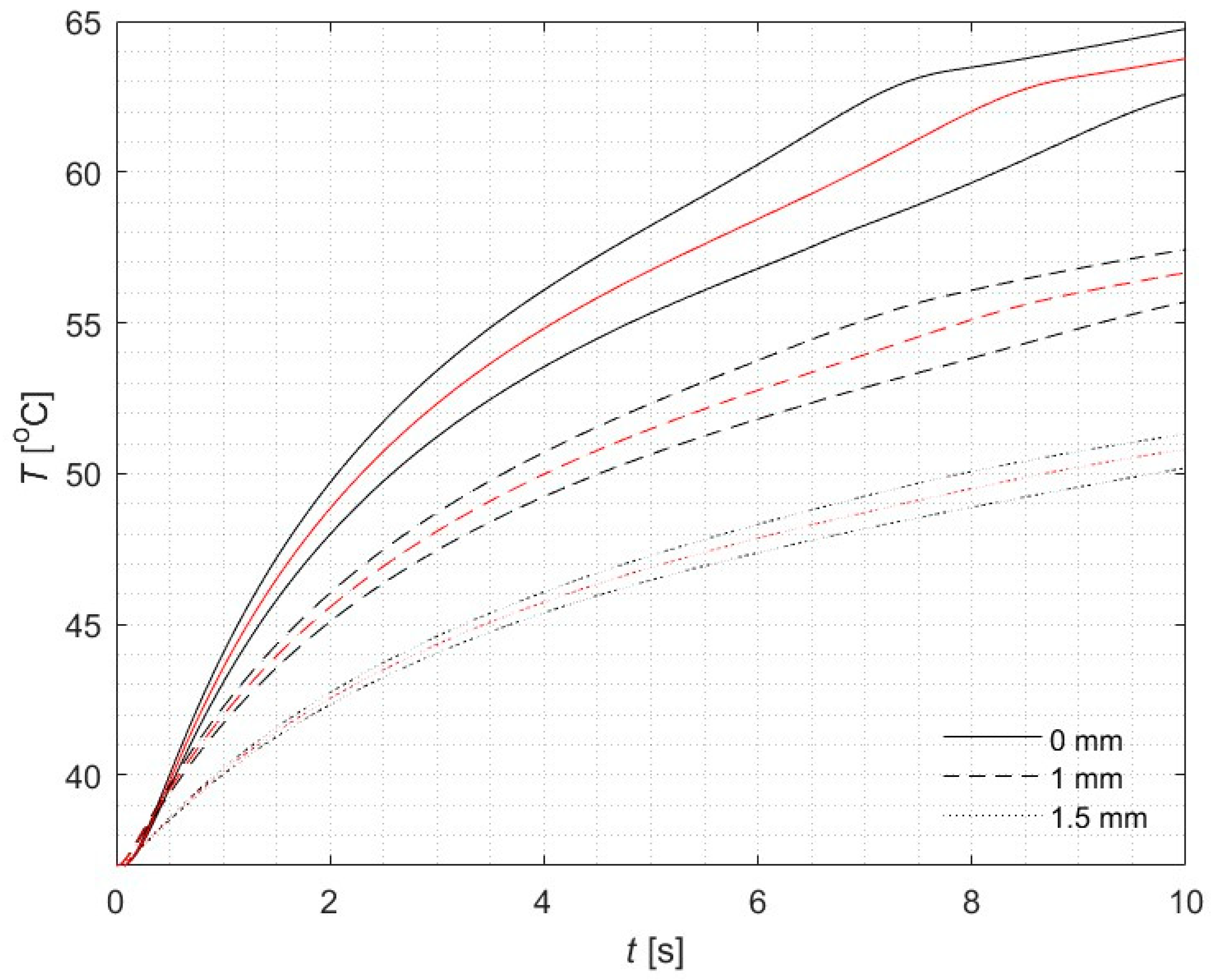 The rest of the analysis is concentrated at the point (0, 2.5) mm, where the maximum concentration of MNPs is located, resulting in the highest temperature rise (