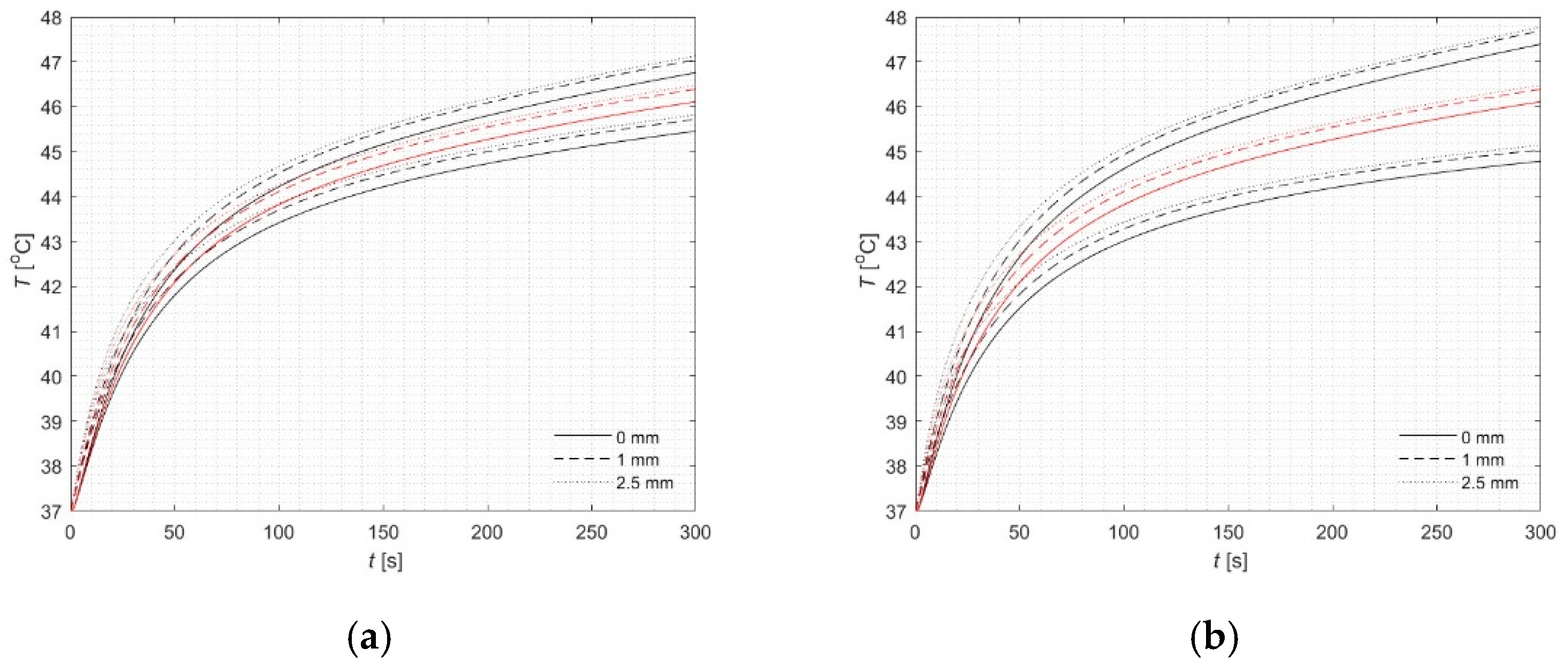 Figure 8). These analyses reveal how uncertainty in the parameters not only affects the instantaneous temperature but also the cumulative thermal damage and source term distribution, which are critical for predicting tissue response during therapy. The magnitude of input parameter fuzziness in numerical analysis is typically selected based on the expected level of uncertainty associated with experimental measurements, material properties, or boundary conditions. This uncertainty can stem from variability in biological tissue characteristics, limitations in measurement precision, or natural fluctuations in environmental conditions. In practice, the fuzzy spread (e.g., the width of the triangular fuzzy number) is defined using expert knowledge, statistical data, or past sensitivity studies. The aim is to capture realistic variability without introducing excessive computational burden. Therefore, a balance must be struck between representing input uncertainty accurately and maintaining numerical stability and efficiency.